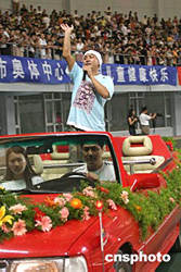 由中國(guó)兒童少年基金會(huì)主辦的“關(guān)愛兒童遠(yuǎn)離傷害”中國(guó)明星足球隊(duì)對(duì)戰(zhàn)公益企業(yè)聯(lián)隊(duì)義賽八日晚在河北省秦皇島市舉行,來(lái)自中國(guó)香港演員張衛(wèi)健在比賽前的慈善晚會(huì)上獻(xiàn)歌助興。中新社記者:廖文靜