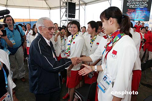 薩馬蘭奇與中國游泳隊員握手交談。當地時間八月九日上午,參加雅典奧運會的中國體育代表團在雅典奧運選手村舉行升旗儀式時,國際奧委會主席薩馬蘭奇專程前來看望代表團成員。中新社記者:毛建軍