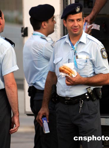 當(dāng)?shù)貢r間八月九日中午,幾名參與雅典奧運(yùn)會安保的希臘警察依次領(lǐng)取簡易的工作午餐。中新社記者:任晨鳴