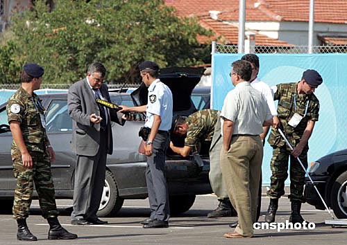 當(dāng)?shù)貢r間八月九日,進入希臘雅典奧運選手村的人員與車輛正接受警員的嚴格檢查,以確保安全。中新社記者:毛建軍