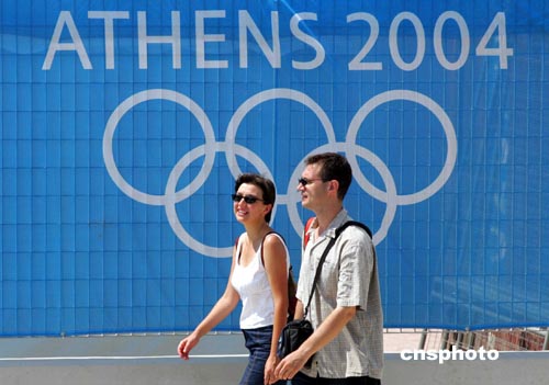2004雅典奧運會開幕在即,雅典街頭的“奧運味道”也越來越濃。圖為一對青年男女經(jīng)過雅典奧運標(biāo)志牌。中新社記者:張煒