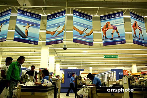 奧運會開幕在即,希臘雅典的商家們借奧運東風開展促銷,家樂福超市里掛滿體育彩旗,宣傳推介當地出產的日用品。中新社記者:王瑤