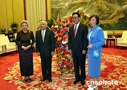 中新社北京八月九日電 (記者 朱大強(qiáng))中國(guó)全國(guó)人大常委會(huì)委員長(zhǎng)吳邦國(guó)今天在人民大會(huì)堂會(huì)見(jiàn)了柬埔寨國(guó)王諾羅敦·西哈努克和王后諾羅敦·莫尼列·西哈努克。賓主進(jìn)行了親切友好的交談。