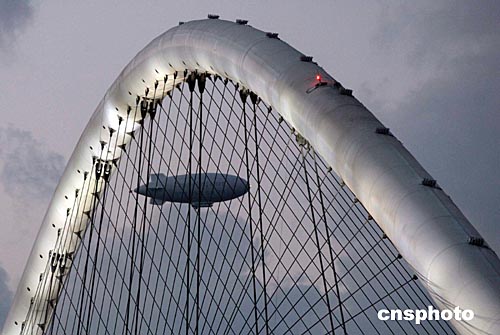 當(dāng)時(shí)時(shí)間8月10日晚,一架監(jiān)視飛艇從雅典主體育場(chǎng)上空飛過(guò)。體育場(chǎng)的巨大拱梁恰似一架巨大的豎琴,與飛艇共同奏出和諧的音符。這里正在舉行最后一次開(kāi)幕式彩排。中新社記者:張煒
