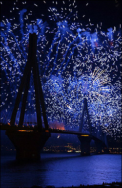 中新網(wǎng)8月11日電 據(jù)法新社消息,在雅典奧運到來之前,雅典已經(jīng)開始著各項慶祝儀式。圖為雅典Rio-Antirio大橋上的煙花匯演。