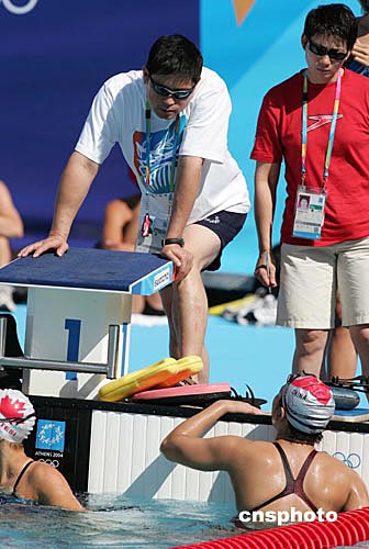 當?shù)貢r間八月十一日上午,中國游泳隊教頭趙戈在雅典奧運比賽場指導隊員進行熱身訓練。中新社記者:毛建軍