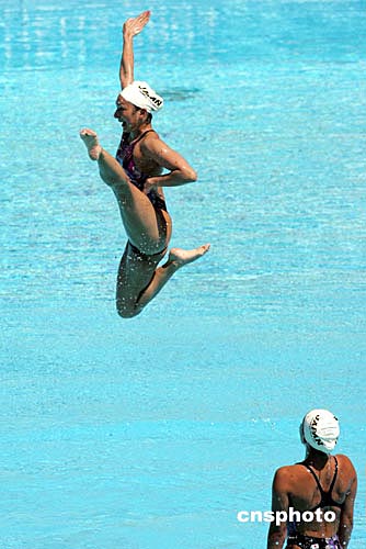 當(dāng)?shù)貢r間八月十一日上午,日本花樣游泳選手在雅典奧運比賽場進行熱身訓(xùn)練,動作奇特。中新社記者:毛建軍