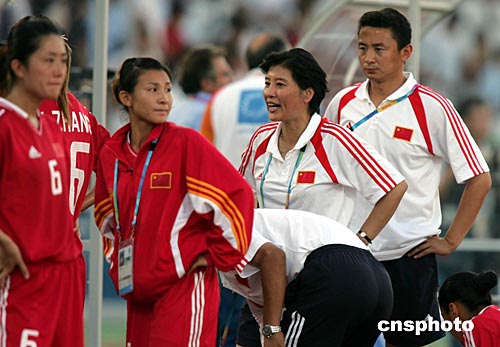 在奧運會女足小組賽中,中國女足排出了老中青相結(jié)合的433陣型。第12分鐘,德國隊2號施特格曼大腳斜傳到禁區(qū)內(nèi),世界杯金靴普林茨搶躍起點頭球頂門,皮球應(yīng)聲入網(wǎng),德國隊1比0領(lǐng)先。落后的中國女足多次發(fā)動長傳,但在高空優(yōu)勢明顯的德國隊面前沒有任何用處,反而被普林茨遠門柱俯身沖頂將比分改為2比0。