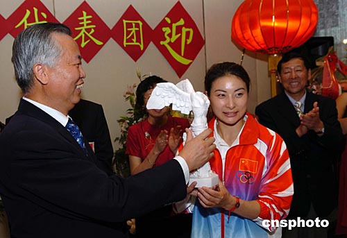 中國跳水隊(duì)靚女郭晶晶獲中國駐希臘大使唐振琪贈(zèng)送“勝利女神”,寓意旗開得勝。作者:陳佳
