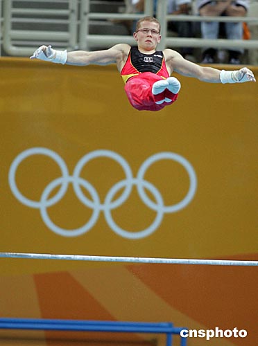 中國男子體操隊當(dāng)?shù)貢r間八月十一日晚上在雅典奧運體操比賽館與德國、日本、烏克蘭隊進行集體合練,德國選手進行單杠訓(xùn)練。中新社記者:毛建軍
