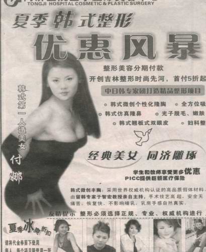 前不久,楊欣一位朋友讀報(bào)時(shí)偶然間發(fā)現(xiàn)了整形廣告上的這張照片,立即聯(lián)絡(luò)楊欣,待楊欣本人拿著自己那張代表性照片與廣告上的照片仔細(xì)比對(duì)后,也驚呆了:兩張照片除了臉面不同,從衣著、身材、姿勢(shì)到頭發(fā)全都像一個(gè)模子里刻出來(lái)的,甚至連叉開(kāi)手指的右手的手形和位置也毫厘不爽。更離奇的是,在這張“換頭”照片旁邊,顯眼地寫(xiě)著一行字“韓式第一人造美女付娜”。