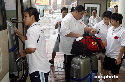 8月12日,中國舉重隊的重量級選手唐功紅在中國國家體育總局訓(xùn)練局收拾行囊出征雅典奧運(yùn)會。中國舉重隊第二批隊員是日出發(fā)雅典。中新社記者:盛佳鵬