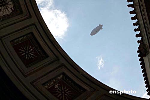 8月12日,一架監(jiān)視飛艇從雅典市區(qū)上空飛過,監(jiān)視各種情況的發(fā)生,以確保奧運(yùn)會的安全。中新社記者:王瑤