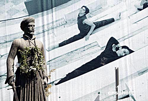 雅典街頭的古代石像與奧運廣告牌相互映襯,別據(jù)一格。中新社記者:王瑤