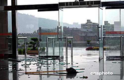 八月十二日下午四時(shí)許,山城重慶突降暴雨,給一度氣溫達(dá)到四十?dāng)z氏底的“火爐”帶來(lái)了些許涼爽。暴雨造成重慶多處路段積水嚴(yán)重、行道樹、電線桿被吹倒,同時(shí)造成了一定程度的交通堵塞。圖為一展館玻璃門被風(fēng)吹垮,玻璃散落一地。作者:郭晉嘉