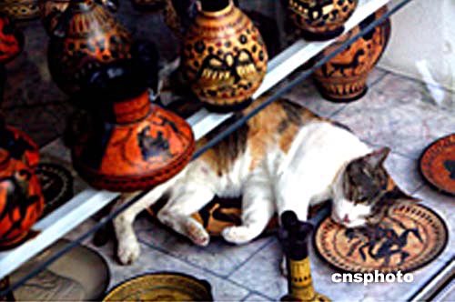 奧運(yùn)開幕在即,盡管外界氣氛緊張,一只家貓?jiān)谘诺涞墓に嚻飞痰隀淮袄锖ㄈ蝗胨。中新社記?王瑤