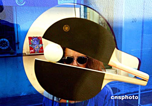 奧運開幕前,在雅典市中心的奧運主題一條街上,一名游客正仔細(xì)觀看作為藝術(shù)品陳列的乒乓球拍。中新社記者:王瑤
