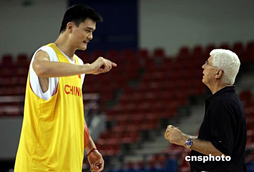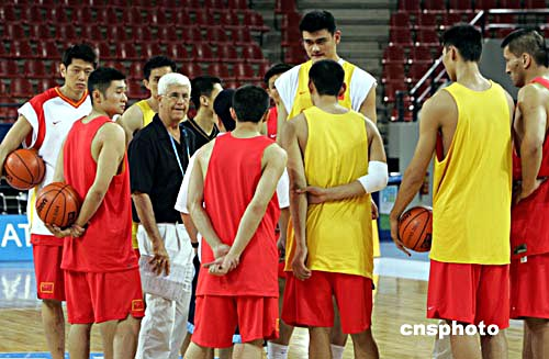 當(dāng)滿頭銀發(fā)的中國男籃主帥哈里斯姍姍出現(xiàn)在訓(xùn)練館內(nèi)時(shí),隊(duì)員們開始集合,此時(shí)比預(yù)定的訓(xùn)練時(shí)間晚了半個(gè)多小時(shí)。在例行的熱身活動(dòng)后,中國男籃分成黃、紅兩隊(duì)進(jìn)行了幾套戰(zhàn)術(shù)的演練。由姚明、易建聯(lián)、李楠、劉煒、朱芳雨等組成的黃隊(duì)無疑是中國男籃的主力陣容。