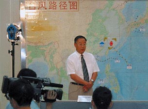 8月12日下午4時,秦大河來到中央氣象臺天氣會商室,在臺風(fēng)示意圖前現(xiàn)場拍攝,向廣大電視觀眾發(fā)布臺風(fēng)警報:今天上午,浙江沿海已經(jīng)出現(xiàn)了暴雨和10級以上大風(fēng),今天晚上到明天,受云娜臺風(fēng)的影響,浙江和江蘇南部的沿海地區(qū)有10到12級大風(fēng);江南大部將有大或暴雨,部分地區(qū)有大暴雨或特大暴雨,并可能發(fā)生泥石流或山體滑坡等地質(zhì)災(zāi)害。秦大河強調(diào)指出:云娜臺風(fēng)是自1997年以來在浙江登陸的最強的臺風(fēng),提請有關(guān)單位注意當?shù)貧庀笈_站的預(yù)報預(yù)警,做好防范措施。(宋云、大康)