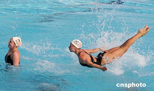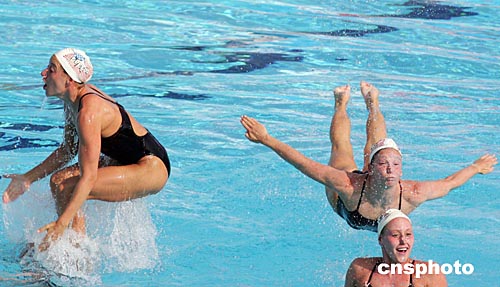 美國(guó)女子花樣游泳隊(duì)當(dāng)?shù)貢r(shí)間八月十二日下午在雅典奧運(yùn)花樣游泳比賽場(chǎng)進(jìn)行賽前訓(xùn)練,動(dòng)作新穎,造型別致。