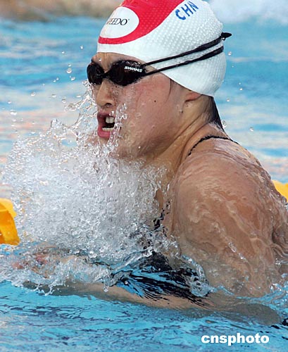 中國(guó)游泳名將羅雪娟當(dāng)?shù)貢r(shí)間八月十二日下午在雅典奧運(yùn)賽場(chǎng)進(jìn)行賽前訓(xùn)練。中新社記者:毛建軍