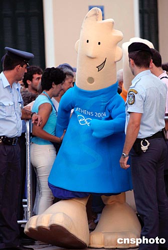 當(dāng)?shù)貢r(shí)間8月12日傍晚,奧運(yùn)火炬即將到達(dá)雅典衛(wèi)城。雅典市民夾道歡迎。奧運(yùn)吉祥物在警察的護(hù)衛(wèi)下來(lái)到現(xiàn)場(chǎng)。中新社記者:張煒