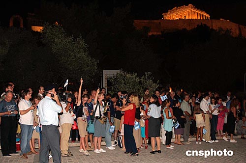 當(dāng)?shù)貢r間8月12日傍晚,奧運(yùn)火炬即將到達(dá)雅典衛(wèi)城,市民夾道迎接圣火到來。中新社記者:張煒
