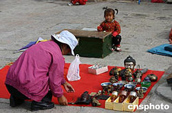 位于拉薩市西郊根培烏山上海拔三千八百米的哲蚌寺,是旅游者到拉薩的必游之地,一位藏族婦女清早便帶著她的女兒來到哲蚌寺門前,將一些具有地方特色的旅游紀(jì)念品擺上地攤等待游客的到來。作者:魯彥