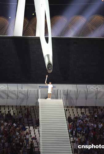 當(dāng)雅典的名字亮起來后,一號(hào)火炬手高舉奧林匹克火炬跑進(jìn)體育場(chǎng),經(jīng)過六次傳遞后,火炬到了科納馬納斯基手中,他停在合唱臺(tái)前面,向全體觀眾展示火炬,然后橫穿場(chǎng)地,這時(shí)“針鼻”火炬臺(tái)開始慢慢往下折,科納馬納斯基再一次轉(zhuǎn)過身來,向大家展示火炬,最后把火炬點(diǎn)燃。