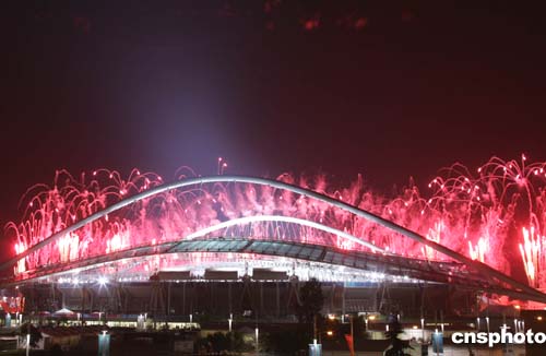 當(dāng)?shù)貢r(shí)間8月13日晚,雅典奧運(yùn)會(huì)盛大的開幕式在主體育場(chǎng)舉行,五顏六色的焰火映紅雅典夜空。中新社記者:任晨鳴