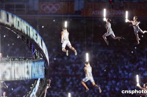 當(dāng)?shù)貢r(shí)間八月十三日晚,第二十八屆奧運(yùn)會(huì)在希臘雅典開(kāi)幕。圖為奧運(yùn)開(kāi)幕式上的飛天表演。中新社記者:毛建軍