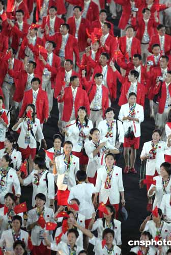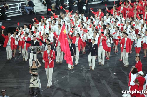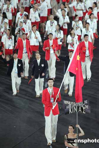 當(dāng)?shù)貢r間八月十三日晚,第二十八屆奧運(yùn)會在希臘雅典開幕。圖為中國體育代表團(tuán)以龐大陣容進(jìn)入會場。中新社記者:毛建軍