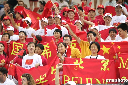 當(dāng)?shù)貢r(shí)間八月十四日,第二十八屆奧運(yùn)會(huì)女籃比賽拉開戰(zhàn)幕,中國女籃在雅典赫利尼科籃球館首戰(zhàn)韓國以七十一比五十四獲得勝利。圖為中國啦啦隊(duì)在賽場為女籃姑娘們吶喊助威。中新社記者:毛建軍