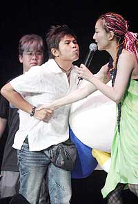 唱完一曲后,男歌迷“五金”竟欲一把抱走獎品Hello Kitty的布娃娃,鄭秀文還來不及阻止,他又捉住鄭秀文的手,并嘟起嘴要吻鄭秀文說:“你就給我Hello Kitty吧,雖然我唱得沒安仔(許志安)好!毙液肧ammi眼明手快擋開對方,才沒有被揩油,當(dāng)時鄭秀文大聲說著:“下臺!下臺!要Hello Kitty就拿去吧,這燈你也拆走吧!”