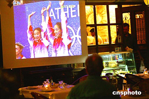 八月十四日晚,中國(guó)跳水健兒郭晶晶、吳敏霞為中國(guó)隊(duì)獲得一枚奧運(yùn)金牌。圖為雅典市民在一家意大利式餐廳里關(guān)注這一賽事的電視直播節(jié)目。中新社記者:王瑤
