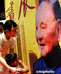 八月十五日在深圳舉辦的朱繼峰紀(jì)念鄧小平誕辰一百周年書畫展上,兩位小朋友在鄧小平畫像前。對(duì)鄧小平有特殊感情的深圳人目前正采取多種形式紀(jì)念這位偉人。中新社記者:宋吉河
