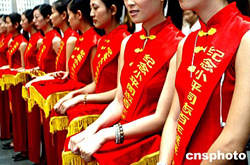 為期一周的朱繼峰紀(jì)念鄧小平誕辰一百周年書畫展八月十五日在深圳舉行,身披彩帶的禮儀小姐陣容洋溢著喜慶氣氛。中新社記者:宋吉河