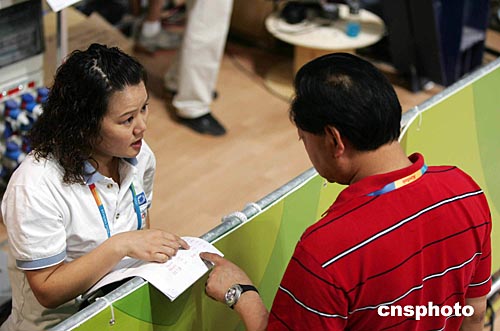 當(dāng)?shù)貢r(shí)間八月十五日上午,在雅典舉行的第二十八屆奧運(yùn)會(huì)女子十米氣手槍射擊決賽賽場,中國射擊隊(duì)前奧運(yùn)冠軍張山為中央電視臺(tái)做主持人客串記者。圖為張山與中國射擊隊(duì)教練許海峰在場邊交談。中新社記者:毛建軍