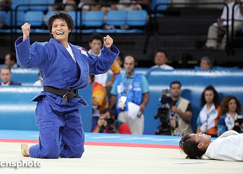 僅用了不到一分鐘的時(shí)間,身高一米五八的冼東妹就將二十三歲的日本選手橫澤由貴壓倒在地,并以“一本”戰(zhàn)勝對手,為中國隊(duì)添上第五金。