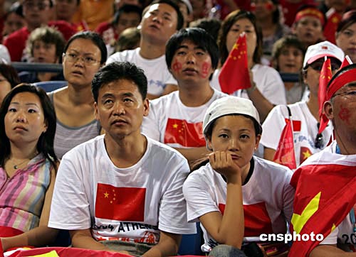 當(dāng)?shù)貢r間8月15日,中國男籃在雅典奧運會首輪比賽中迎戰(zhàn)西班牙隊,最終中國隊以大比分負(fù)于對手。圖為現(xiàn)場觀戰(zhàn)的中國球迷感到十分失望。中新社記者:任晨鳴