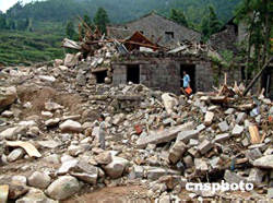 被山群圍繞的災(zāi)害現(xiàn)場(chǎng),七八百米長(zhǎng)的坡型谷地堆積了數(shù)萬(wàn)方從山上瀉下的石塊,大的有數(shù)噸重,泥石流所到之處的民房只剩兩間孤立在坡地西側(cè),但一樓的墻體已被泥石流擊毀;東面谷地邊的小學(xué)教學(xué)樓一樓的兩間教室被泥石流擊穿,里面堆滿了石塊和泥土;谷地正面靠河邊的中學(xué)樓房也多處受損。依著村民手指的方向可以清楚地看到,在谷地里面一座高聳的大山上,有一道長(zhǎng)長(zhǎng)的新裸露的溝壑,村主任潘行岳說:“泥石流就是從那兒下來的。”