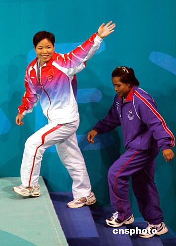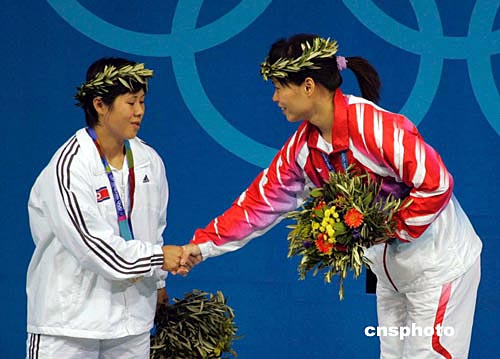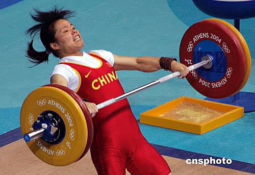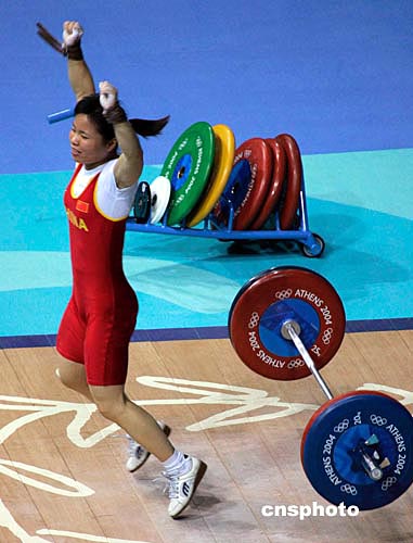 當(dāng)?shù)貢r(shí)間8月16日下午,中國女子舉重名將陳艷青在雅典奧運(yùn)女子58公斤級舉重比賽中獲得冠軍,為中國代表團(tuán)奪得第七枚金牌。作者:張煒