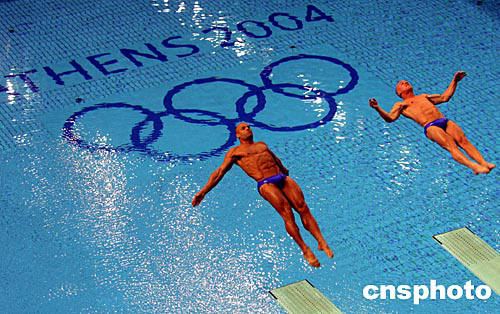 當(dāng)?shù)貢r(shí)間8月16日晚在雅典奧運(yùn)會(huì)跳水館,世界各國選手為實(shí)現(xiàn)各自的奧運(yùn)夢(mèng)想而從十米跳臺(tái)縱身躍入湛藍(lán)的碧波之中。中新社記者:任晨鳴