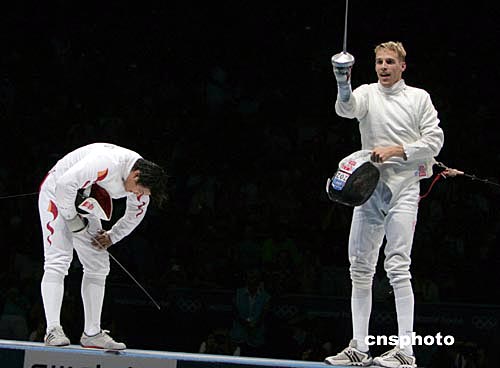 當(dāng)?shù)貢r(shí)間8月17日晚,中國(guó)劍客王磊在雅典奧運(yùn)會(huì)男子重劍決賽中以9:15不敵瑞士名將費(fèi)舍爾,獲得亞軍。中新社記者:任晨鳴
