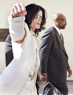 杰克遜這次身著的三件套裝全部為白色,另外他還戴了一個(gè)金色的袖標(biāo)以及腳蹬一雙亮閃閃的白色靴子。他乘坐一輛金色的加長(zhǎng)房車抵達(dá)法庭門口,下車時(shí)受到了100多個(gè)大聲尖叫的歌迷的歡迎。