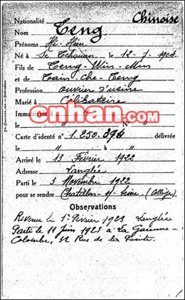 卡片的主要內(nèi)容為———國籍:中國;姓名:鄧希賢;出生:四川,1904年7月12日(中國農(nóng)歷———編者注);父親:鄧文明;職業(yè):工廠工人;婚姻狀況:未婚;身份卡號碼:1·250·349;到達日期:1922年2月13日;居住地點:leangle;離開時間:1922年11月3日;目的地:賽納-夏狄戎中學;備注:1923年2月1日重返leangle;1923年6月11日離去,前往拉加雷納-科隆市的德拉普安特街39號。