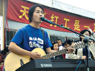 今年夏天,“打工青年藝術(shù)團”被京文唱片發(fā)現(xiàn)并立刻簽約,他們的首張專輯《天下打工是一家》即將在9月份正式發(fā)行。據(jù)京文公司介紹,這張專輯將以發(fā)行卡帶為主,定價將遠遠低于目前市場上的平均水平。結(jié)合新專輯的發(fā)行,京文公司還將配合“農(nóng)友之家”發(fā)起一系列捐助活動,發(fā)動社會各界把舊書、舊電腦捐贈出來給打工子弟學(xué)校的孩子們。屆時,京文公司還會組織“打工青年藝術(shù)團”到全國各地的工廠和工地進行巡演。