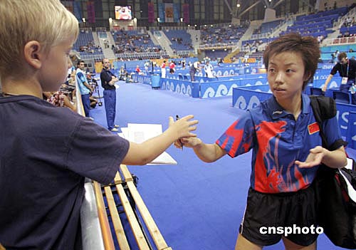 在雅典時(shí)間18日晚進(jìn)行的奧運(yùn)乒乓女單比賽中,中國選手張怡寧以四比一戰(zhàn)勝中國香港選手柳絮飛,晉級八強(qiáng)。中新社記者:張煒