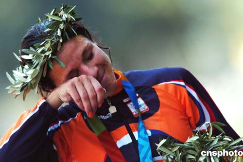 當(dāng)?shù)貢r(shí)間8月18日,荷蘭選手Zijlaard-van-Moorsel喜摘女子自行車(chē)24公里賽桂冠。圖為她和亞軍美國(guó)選手Deidre Demet-Barry及銅牌得主Karin Thuerig一起登上領(lǐng)獎(jiǎng)臺(tái)。