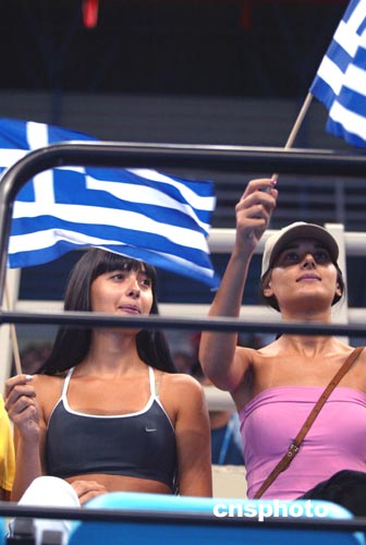 當(dāng)?shù)貢r(shí)間8月18日,男子柔道90公斤級(jí)比賽場(chǎng)邊,兩個(gè)漂亮的觀眾不停揮舞著希臘國(guó)旗助威加油。
